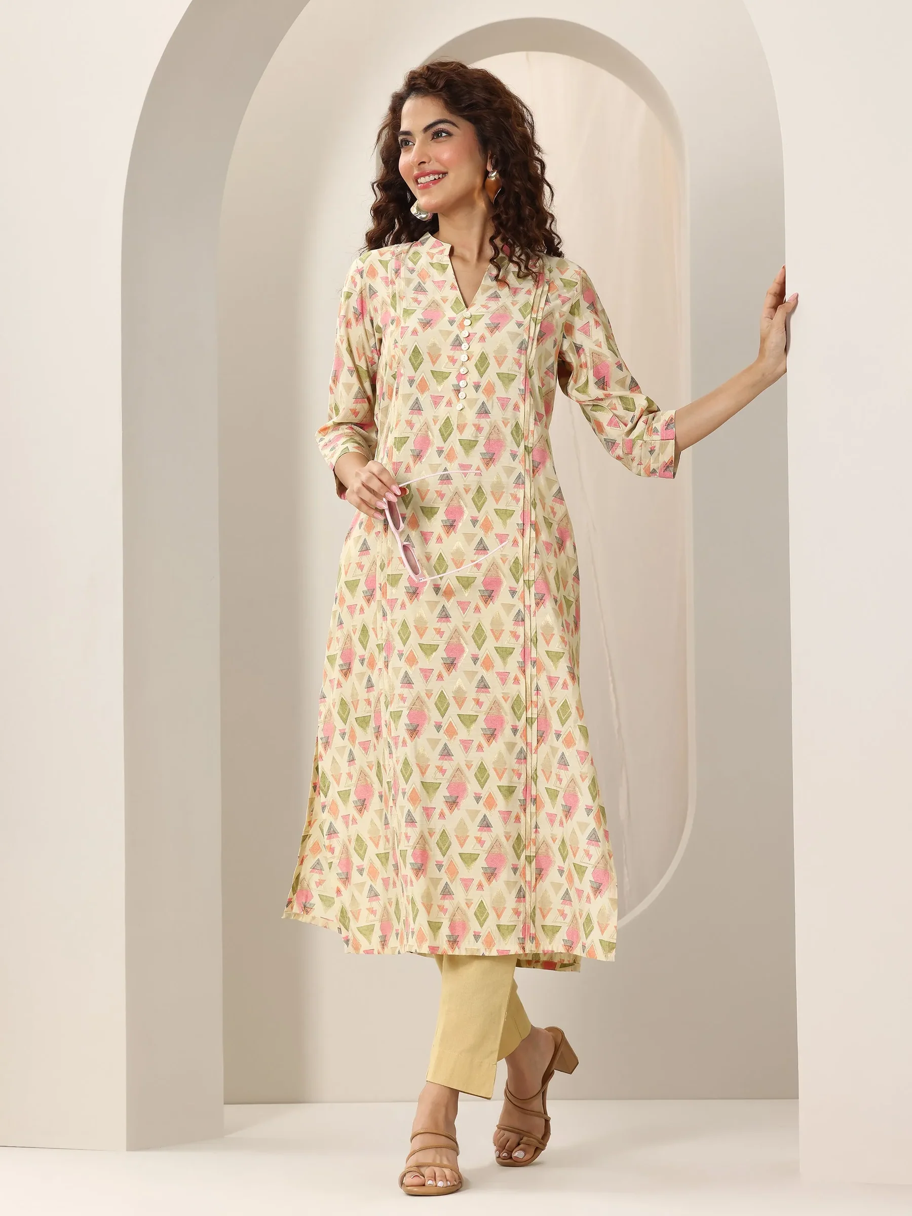 Home Kurta Set Beige Printed Silk Blend Straight Kurta