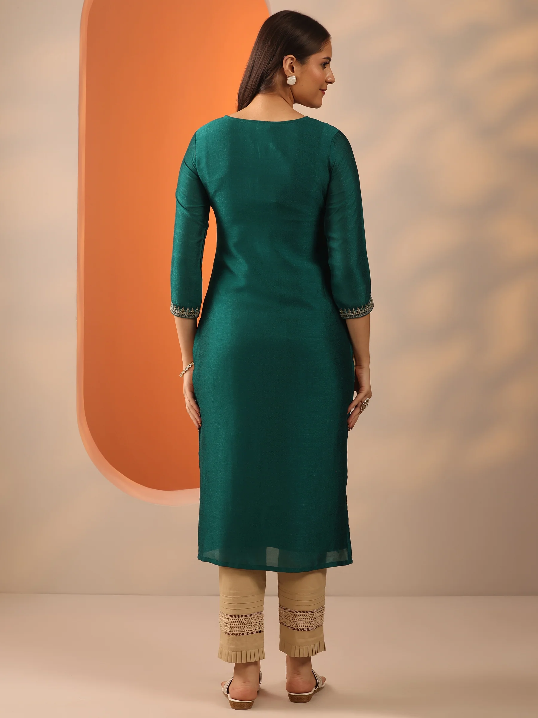 Home Kurta Set Green Embroidered Silk Blend Straight Kurta