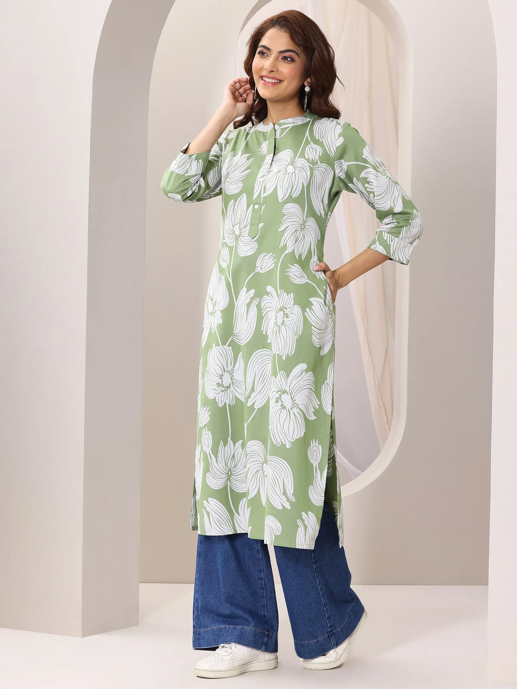 Green Printed Cotton Straight Kurta