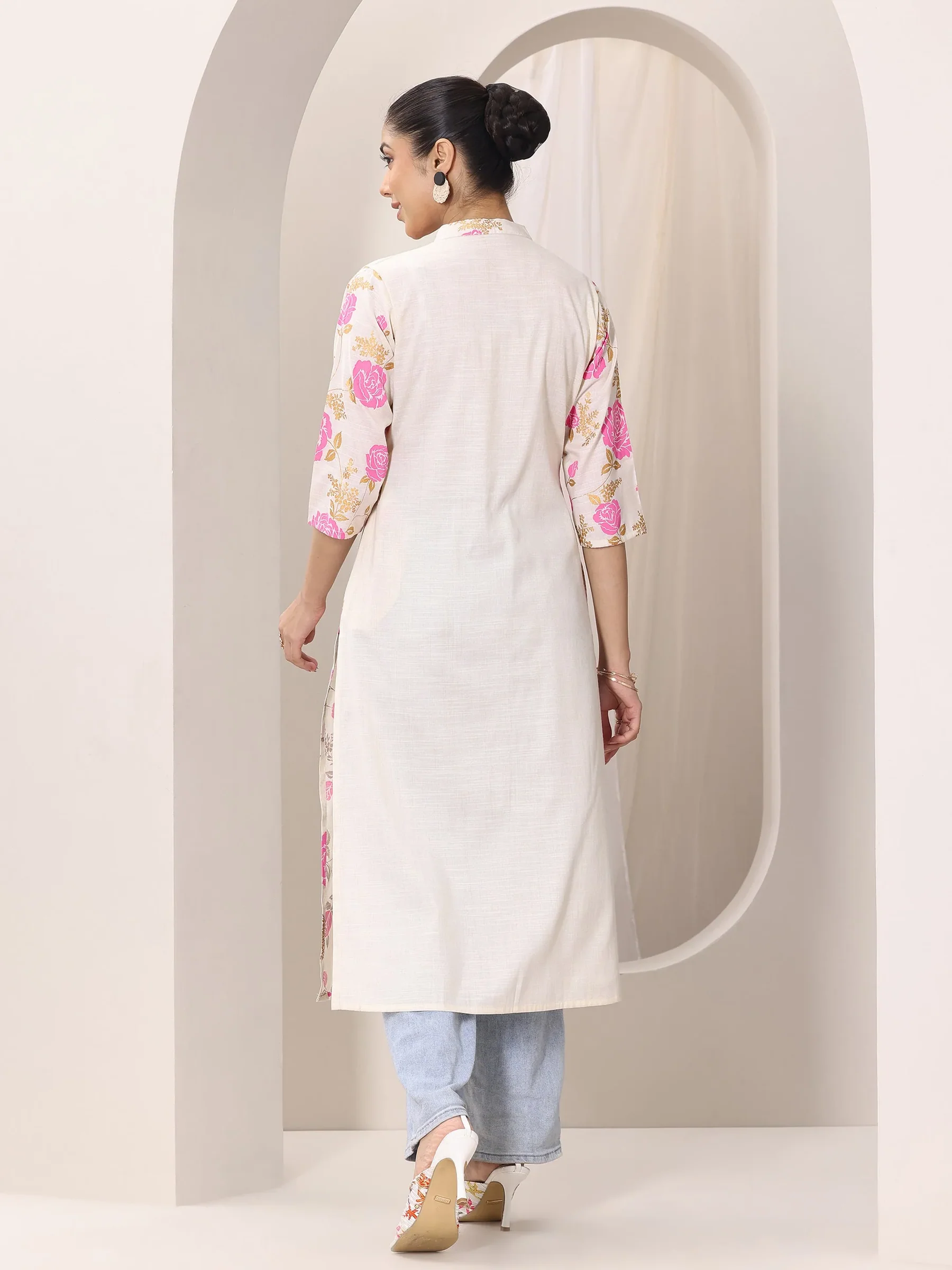 Cream Printed Silk Blend Straight Kurti